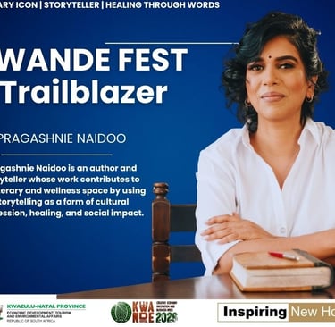 Meet Pragashnie Naidoo Author | Storyteller | Literary Voice of Healing As part of Kwande Fest’s ICON Feature — celebrating individuals shaping KwaZulu-Natal’s Orange Economy — we honour Pragashnie Naidoo, a Durban-based author and storyteller whose work bridges literature, healing, and social reflection. Through her writing, Pragashnie gives voice to lived experiences, generational trauma, and the emotional realities that often go unspoken. Below, she shares her journey in her own words.